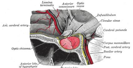肿瘤压迫垂体柄和下丘脑可导致中枢性尿崩症和下丘脑功能障碍,继续向上发展可压迫室间孔、三脑室导致脑积水;向两侧生长可侵入海绵窦引起眼球运动障碍、面部感觉异常;向前方损伤额叶,引起精神障碍、癫痫、嗅觉异常等;像后方生长压迫脑干,引起交叉性麻痹、意识障碍等;向蝶窦方向生长可出现脑脊液漏,甚或引起颅内感染等严重并发症。