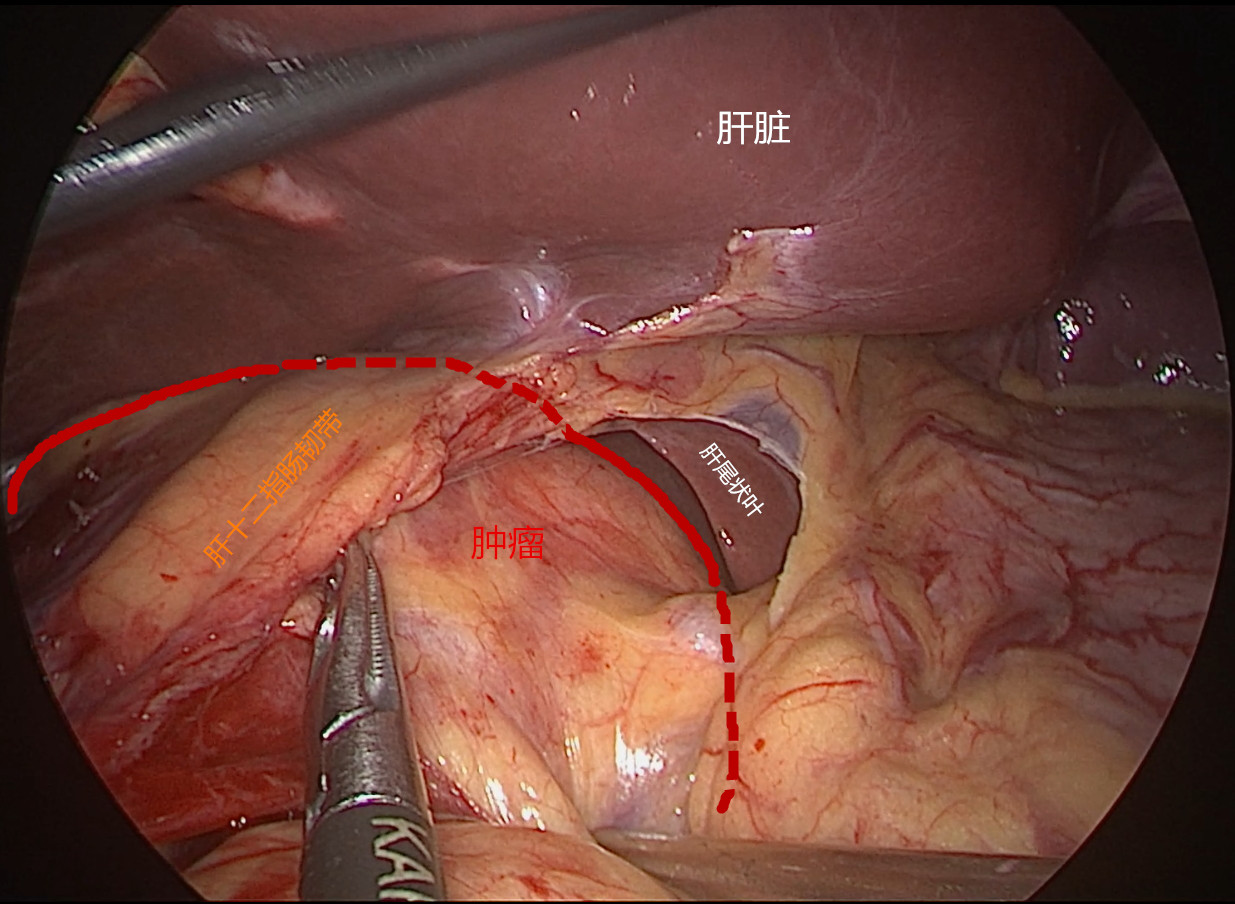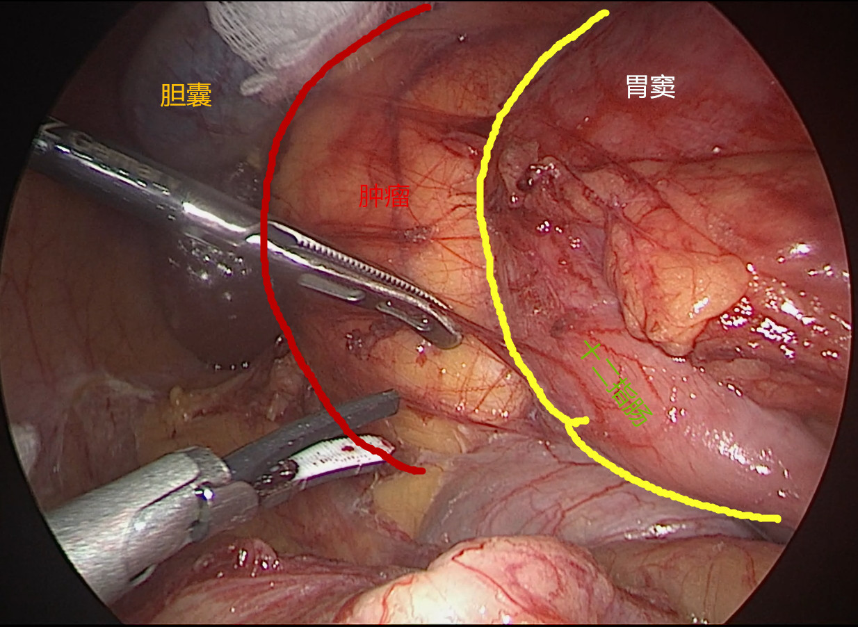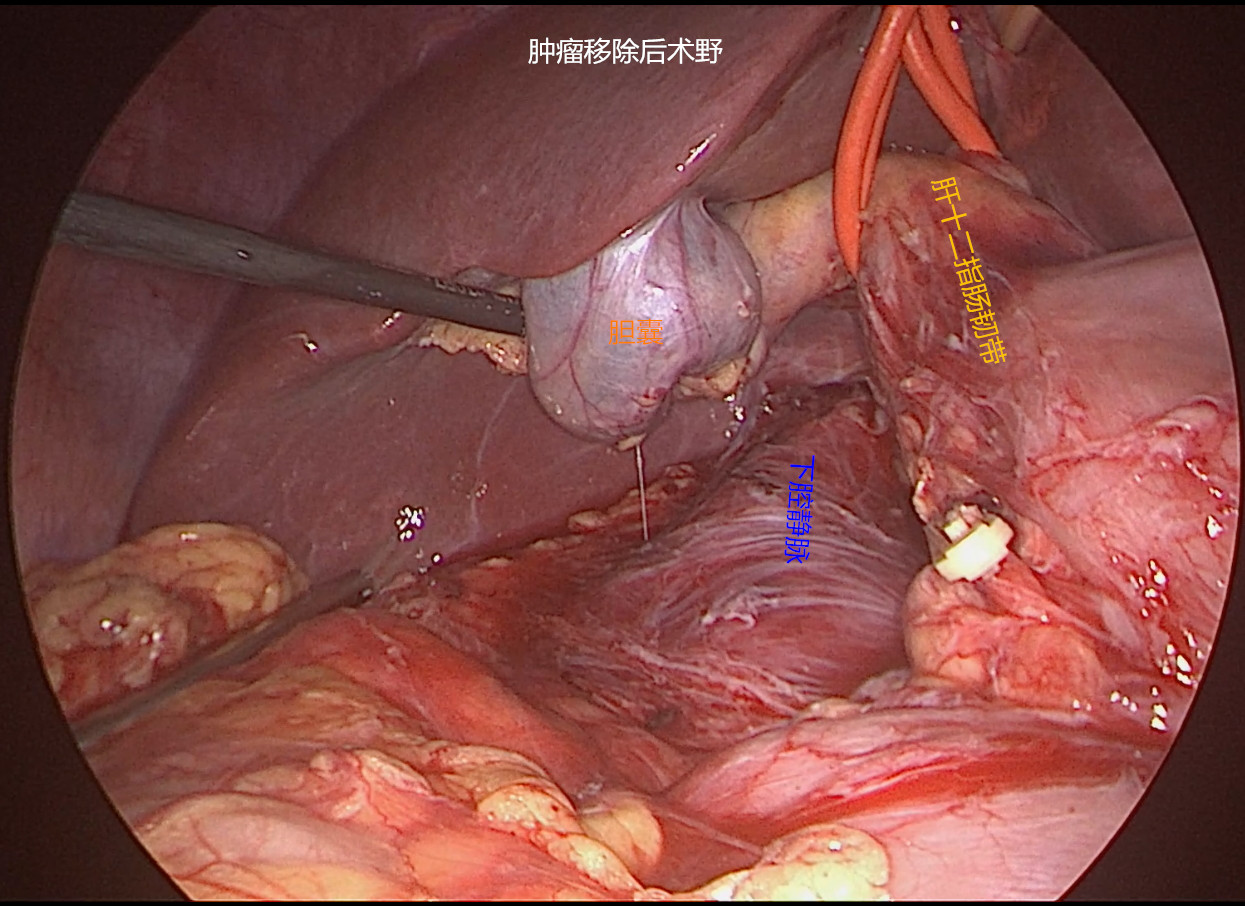 患者女性,45岁,体检发现后腹膜占位2月。CT提示:“胰腺后方可见约63*90mm混杂密度肿块影,内可见囊实性区及脂肪、牙齿,增强扫描实性区动脉期轻度强化,门脉期明显强化,边界清;腹腔干、肠系膜上动脉受压移位,考虑畸胎瘤诊断”。患者后腹膜占位诊断明确,肿瘤较大周围脏器受压,手术指征明确,拟行腹腔镜手术探查。手术困难所在:1.病变位于肝十二指肠韧带、十二指肠、胰头及横结肠后方暴露困难;2.毗邻关系复杂,病变周围与肝脏、胆囊、胆总管、横结肠、胃窦、十二指肠及胰头等重要器官毗邻;3.周围大血管多,病变与门静脉、肝总动脉、腹腔干、肠系膜动静脉、下腔静脉及左肾静脉关系密切,易导致术中大出血;4.病变系囊实性肿块牵引提拉困难。今经过团队两个小时的努力顺利切除肿瘤,术中出血约100ml。感谢麻醉师、护士及团队的辛勤付出,祝患者早日康复。