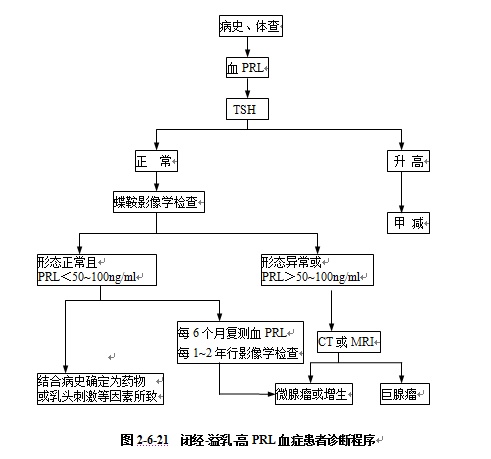 2、产后性高PRL血症(Chiari-Frommel综合征) 约占全部高PRL血症的30%,继发于妊娠、分娩、流产或引产后者,PRL一旦升高后不易下降。本症的PRL仅轻度升高,症状轻微,预后较好