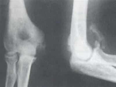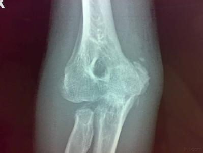 4.对肘关节骨折脱位并延迟处理,或反复手法操作有可能发生骨化性肌炎者,可应用放射治疗。尤其切除骨化块后为预防术后复发更可应用。术后3~4天后进行,总量20Gy,分10次。放射治疗抑制间叶细胞演变能力,但放射治疗可促使骨骺早闭,因此骨骺未闭者禁用。某些药物,如四磷酸盐、消炎痛等也有预防作用。