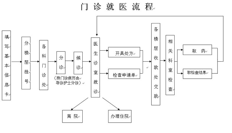 医生开具检查单和处方→到收款挂号窗口交费→持已缴费的检查单和处方到相应科室检查或取药