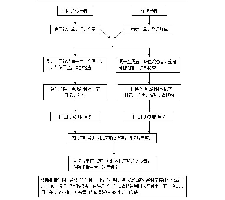 7、摄片地点:普通X线在门急诊综合楼1楼完成,有需要时部分可在医技楼2楼完成,乳腺钼靶、造影检查等特殊X线在医技楼2楼完成。口腔X线在门急诊综合楼8楼口腔放射完成。