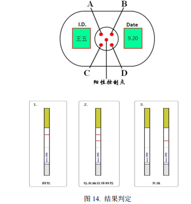 ①结果判定: 阳性:渗滤法—反应板孔中 A、B、C、D 四个特异性抗 原测试点显色,中央阳性控制点显色,为棘球蚴病抗体阳性。 A、B、C、D 四个测试点显色分别为淡红色、红色、紫红色 时,依次判定为“+”、“++”、“+++”;四个测试点中任一点阳 性即视为包虫病抗体阳性。层析法—试纸条上检测线和质控