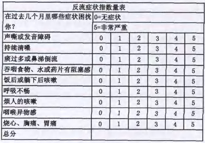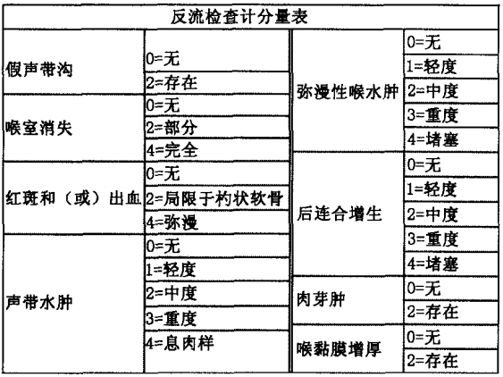 与其他疾病一样,详细的病史和喉镜(电视喉镜、电子喉镜或频闪喉镜等)检查对该类疾病的诊断非常重要。为了全面掌握患者的所有情况和便于诊断,Wake Forest医学院嗓音疾患诊疗中心根据多年的临床研究和患者常见症状、喉镜检查发现病变的严重程度,设计了反流症状指数量表(the reflux symptom index, RSI)和反流检查计分量表(the refluxfinding score, RFS),(见表1、表2),如RSI大于13分,RFS大于7分,可认为异常,加上24小时双探针pH监测发现喉咽部反流事件pH<4超过3次即可诊断本病。