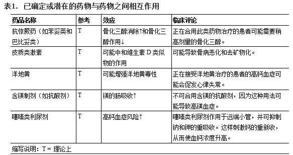 因为骨化三醇是强效胆骨化醇衍生物,对小肠的饮食钙和无机磷酸盐的吸收有显著影响,因此治疗期间应停用维生素D及其衍生物,以免发生可能的相加作用和高钙血症。 只有具备充分的监测血、尿化学的实验室设备时,才能考虑用本品治疗。任何剂型的维生素D用药过量都是危险的。治疗期间,由高反应性或过量用药引起的进行性高血钙可能会非常严重,以至于需要紧急治疗(见【药物过量】)。慢性高钙血症能导致全身性血管钙化,肾钙质沉着、角膜和其它软组织钙化,对可疑解剖学部位进行放射学评价有助于疾病的早期检出。用本品治疗期间,血清钙(mg/dl)与血清无机磷的乘积(Ca×P)不应超过70 mg2/dL2。 透析液钙水平等于或超过7mg%,同时过量供应饮食钙,可能会导致频繁的高血钙症发作。 对透析病人,应该使用非铝盐的磷酸盐结合剂来控制血清无机磷的水平和饮食磷酸盐吸收。含镁的抗酸剂可能会引起长期肾透析病人的高血镁症,在本品治疗期间应当避免使用(见【药物相互作用】)。